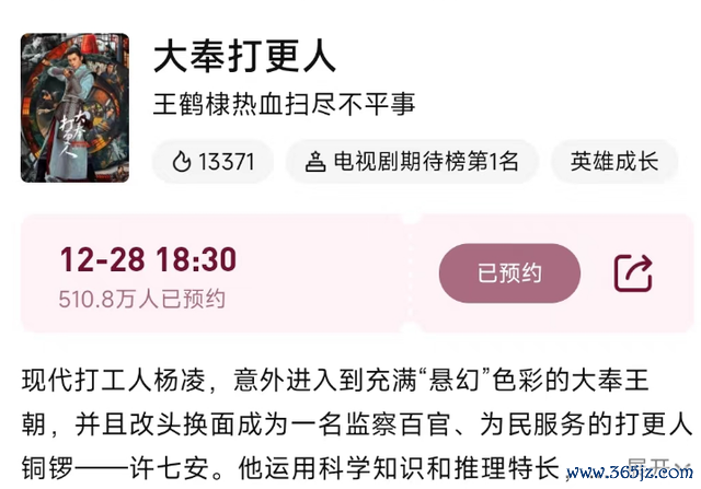 新剧说的是《大奉击柝东谈主》,如故定档12月28日播出,当今在鹅厂的预约数如故冲破500万,妥妥的爆款预定。