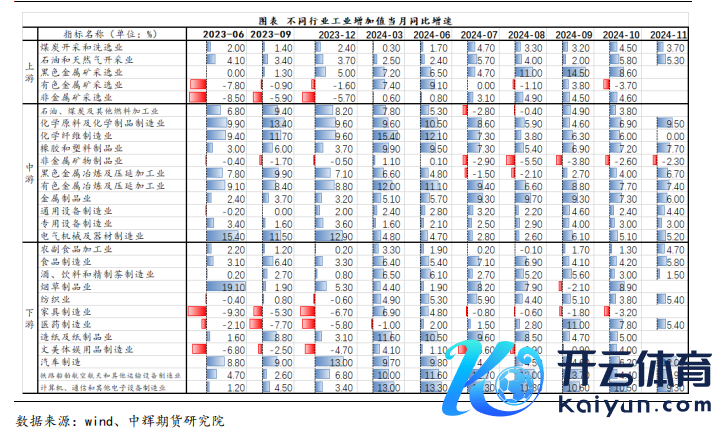 经济数据弱项仍然弱,地产是重要 工业增多值保执阐明 中国2024年1-11月,边界以上工业增多值累计同比5.8%,通顺四个月保执阐明。11月份工业增多值同比高涨5.4%,环比增长0.46%。11月份41大行业中34个(前值是35、36)行业增多值保执同比增长。 汽车行业工业增多值增速12%,汽车工业景气在国内一系列战略刺激之下,数据执续保执壮健。另外有色冶真金不怕火在新经济边界使用较多,重叠上需求影响,11月份增速7.4%,增速较高。因战略刺激预期,玄色金属冶真金不怕火增多幅度较大,从8月份下