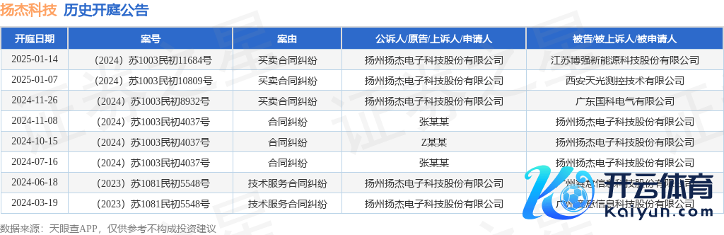 本站音信,把柄天眼查APP领略,近日公布了一则扬州扬杰电子科技股份有限公司行为原告/上诉东说念主的开庭公告,驻守施行如下: