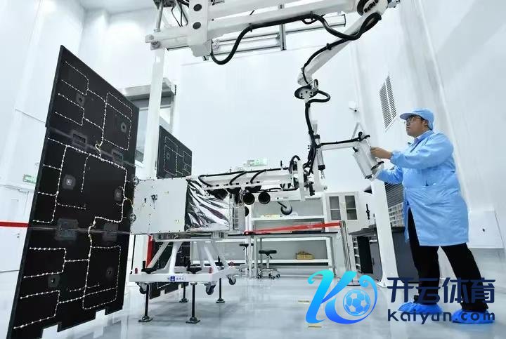 在泰安卫星互联网产业基地,作当事者谈主员使用助力机械臂拼装卫星外壳。