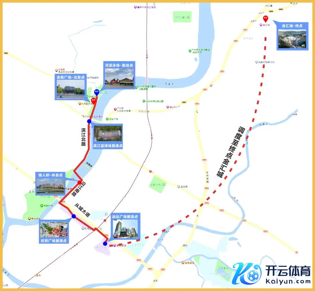 河边泳场(齐集点)—金瓯广场(起点)—河边北路—滨江篮球场(展演点)—河边北路—情东说念主桥(休息点)—沿江南路(新春派福点)—从城通衢—欣荣广场(展演点)—远达广场(展演点)—金汇城(特殊、岭南狮王争霸赛比赛会场)