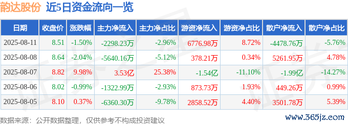 本站音问,鸿沟2025年8月11日收盘,韵达股份(002120)报收于8.51元开云体育,下落1.5%,换手率3.25%,成交量91.5万手,成交额7.77亿元。