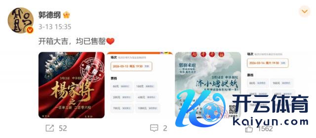 2026 年 3 月 13 日下昼 15 点 35 分,德云社演员郭德纲发微博秘书,德云社麒麟剧社两场开箱大戏《杨家将之一百单三箭,二百零六枪》和《济小塘捉妖》均已售罄,此时距离 3 月 13 日晚 7 点半"杨家将"开场还剩不到四个小时。
