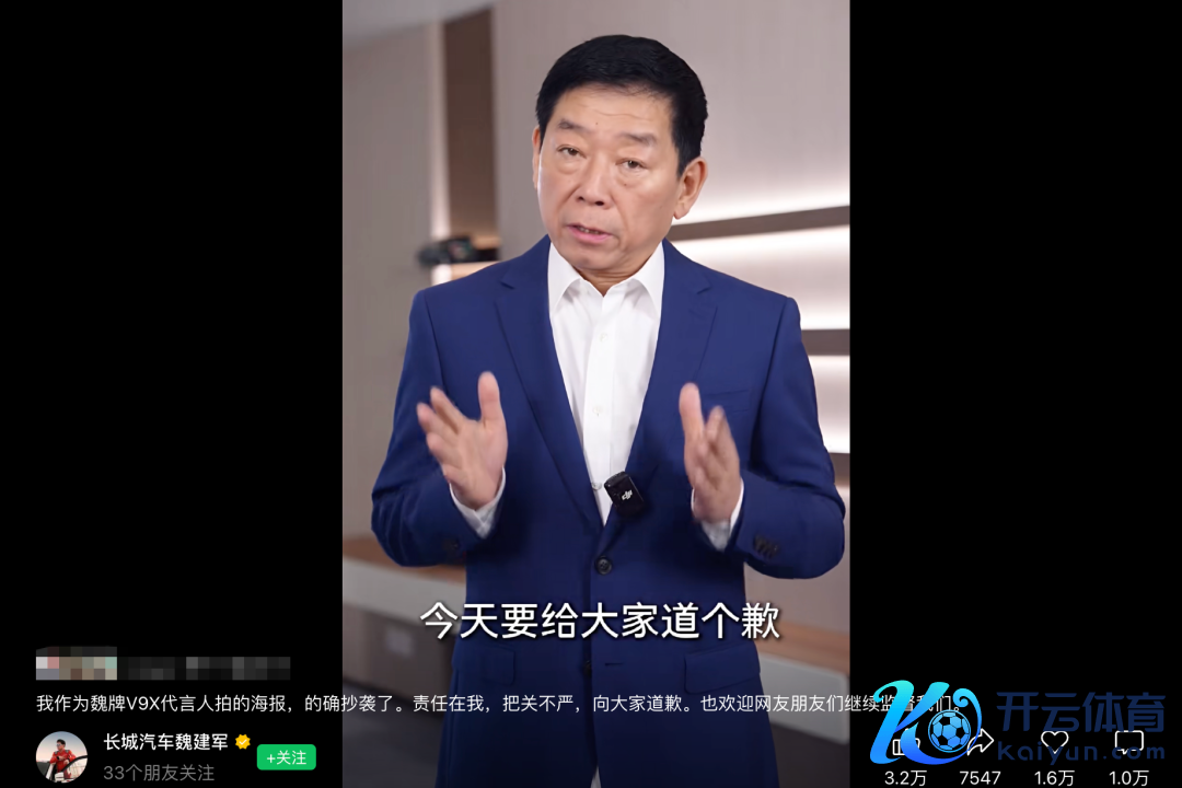 3月6日晚间,长城汽车董事长魏建军通过酬酢账号发布视频,针对昨日出现的海报抄袭问题进行说念歉。 证券时报记者珍贵到,3月5日,长城汽车旗下魏牌官宣了魏建军看成新款车型V9X代言东说念主,并发布了一张海报,郑重的网友们发现魏建军拍摄的海报有抄袭嫌疑。 在视频中,魏建军示意,网友的吐槽都看了,经过核查,那张海报委果是抄袭的,不成有任何的辩解。对此,魏建军在视频中向路虎说念歉,并向原版海报的经营师说念歉,也向信任魏建军的网友一又友们说念歉。 魏建军称:“我和长城汽车也温情承担由此带来的一皆法律和经济